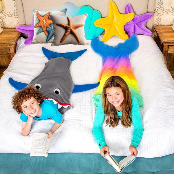 Mehek, visokokakovosten flanelast flis poskrbi, da je otrokom toplo, medtem ko se sproščajo po šoli ali se umirijo za noč. Odlična je za crkljanje na kavču med gledanjem risank ali za ohranjanje toplote v hladnih nočeh. Vaši otroci se bodo hihitali od veselja, ko se bodo zavili v rep morskega psa ali morske deklice.