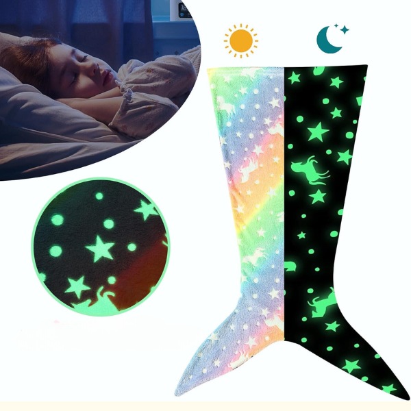 Odejica MERMAIDREAM v sveti v temi ter zagotavlja pomirjujočo svetlobo, ki ublaži nočne strahove. Preprosto jo za 20 minut izpostavite dnevni svetlobi in nežno bo svetila vso noč. Izberite vzorec z repom morskega psa ali morske deklice za dodatno čarobnost med spanjem vašega otroka.